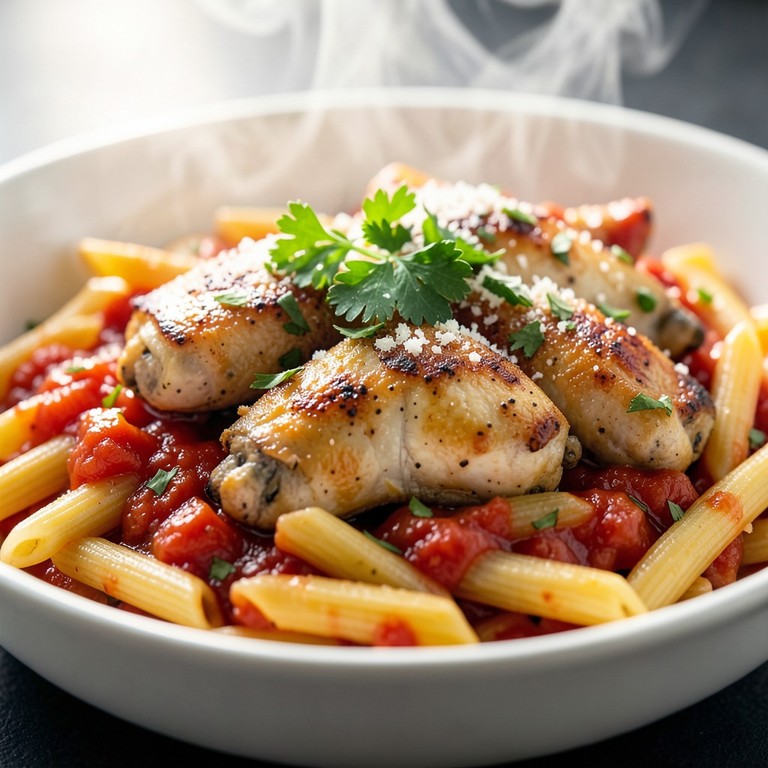 Uma refeição completa e saborosa, preparada em uma única panela para máxima praticidade e limpeza, combinando macarrão, suculentas coxas de frango e um rico molho de tomate.