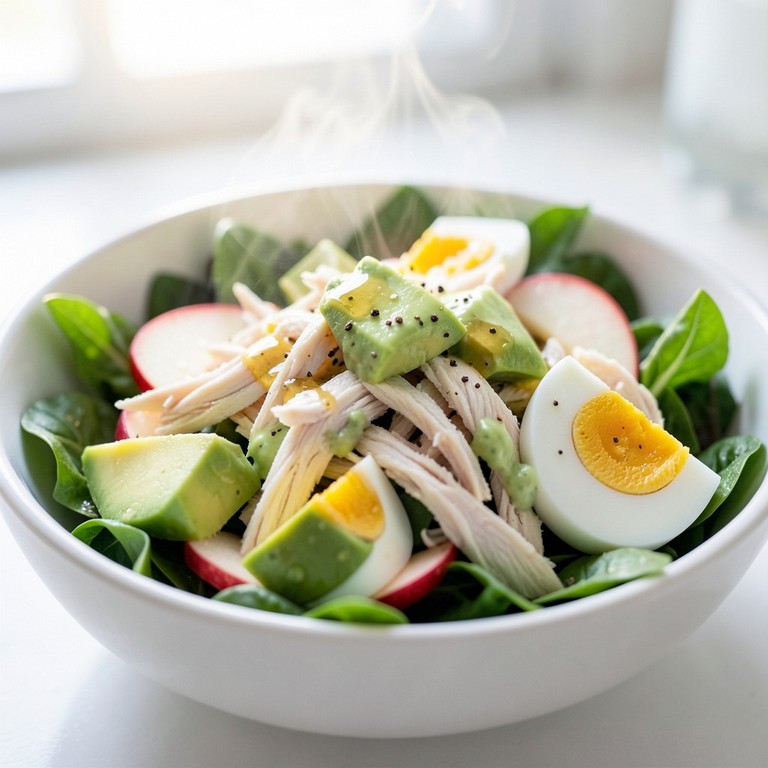 A modern and nutritious bowl combining tender shredded chicken, creamy avocado, perfectly hard-boiled eggs, and crisp apple slices for a refreshing crunch, all brought together with a light vinaigrette.