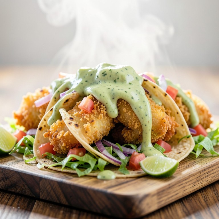 Tacos de Peixe Crocante com Molho Cremoso de Abacate e Coentro