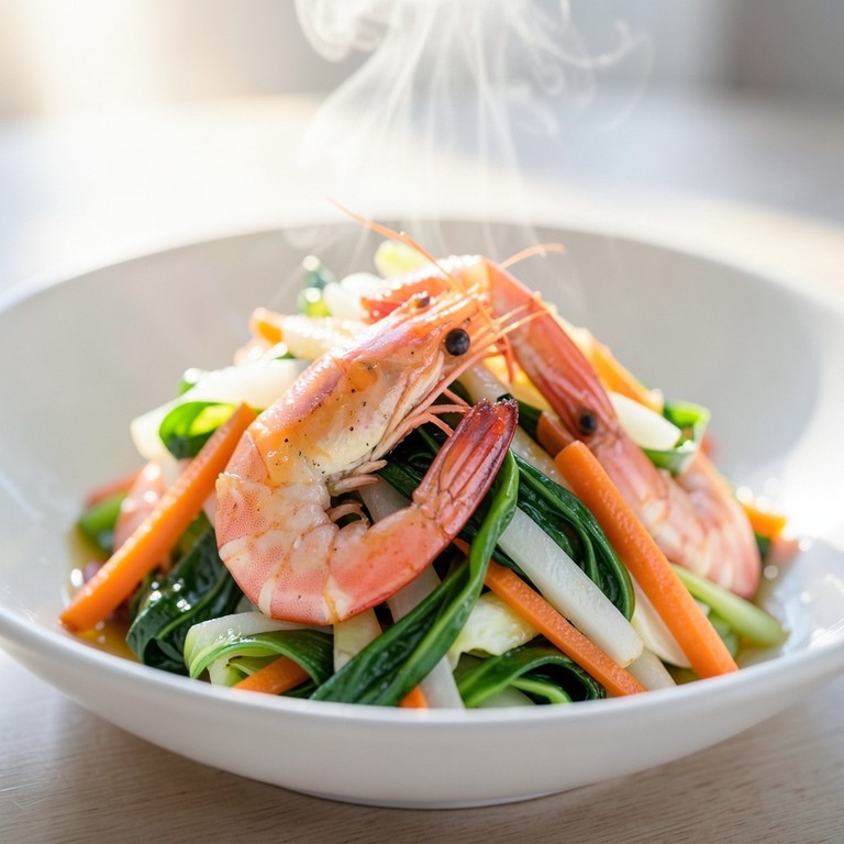 Camarões suculentos e rapidamente salteados com acelga e repolho crocantes, temperados de forma simples e deliciosa com alho e cebola, resultando em um prato leve e saboroso.
