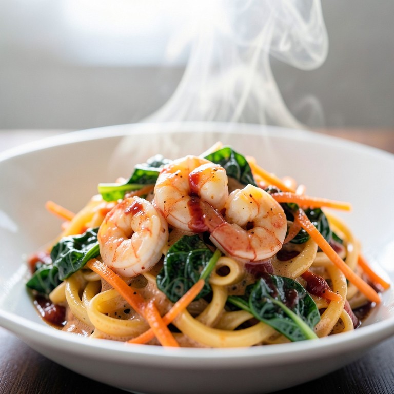 Um prato reconfortante e saboroso, com camarões suculentos e vegetais frescos em um molho cremoso, perfeito para uma refeição rápida e deliciosa.