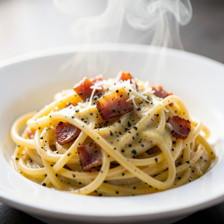 A classic Roman pasta dish featuring al dente spaghetti coated in a rich, creamy sauce made from eggs, Pecorino Romano cheese, crispy guanciale, and plenty of black pepper.