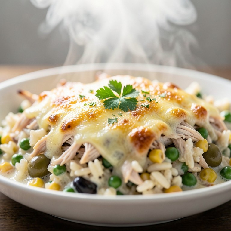 Uma refeição completa e reconfortante, perfeita para um jantar em família, com frango desfiado, arroz cremoso e uma deliciosa camada de queijo gratinado.
