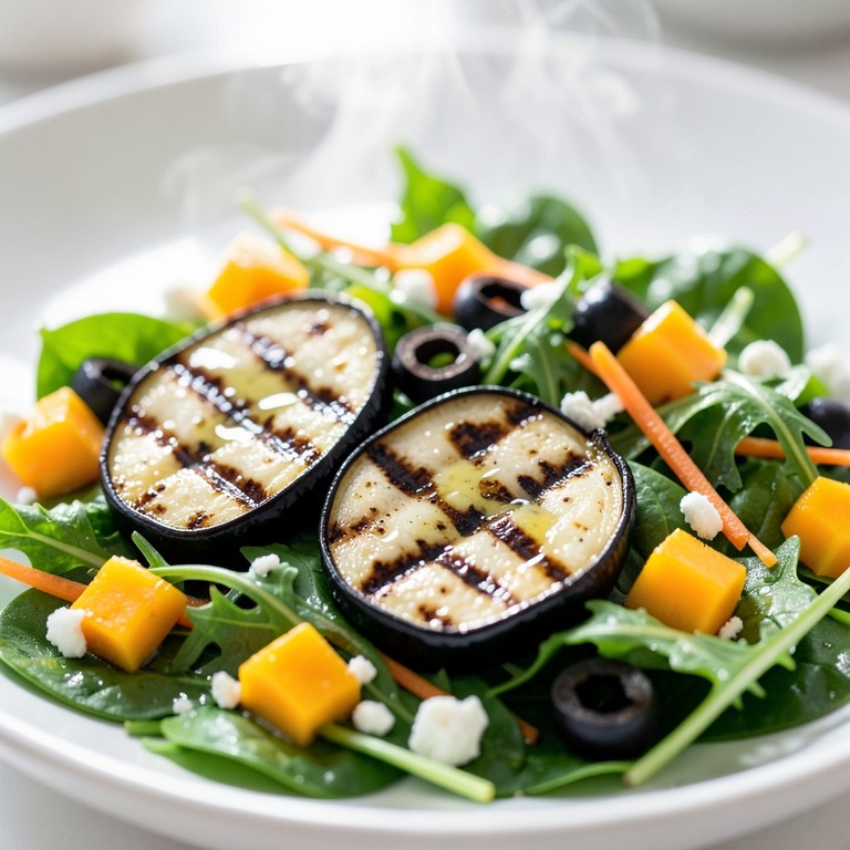 Uma salada vibrante e fresca, combinando a doçura da manga com a berinjela grelhada e folhas verdes, realçada por um leve molho cítrico. Perfeita para uma refeição leve e saborosa.