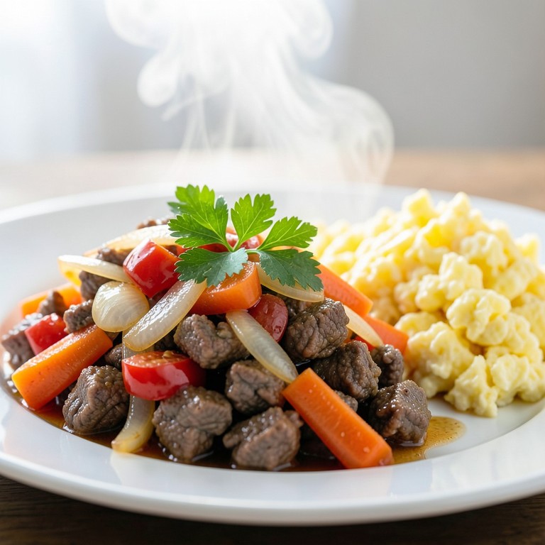 Um picadinho de carne rápido e saboroso, refogado com cebola, cenoura e tomate, servido com ovos mexidos cremosos. Perfeito para uma refeição nutritiva e prática.