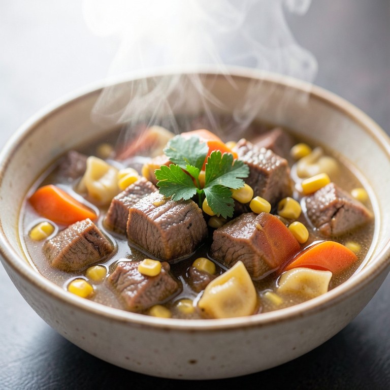 Um ensopado robusto e nutritivo, perfeito para aquecer, com carne de porco macia, macarrão, milho e cenoura em um caldo saboroso.