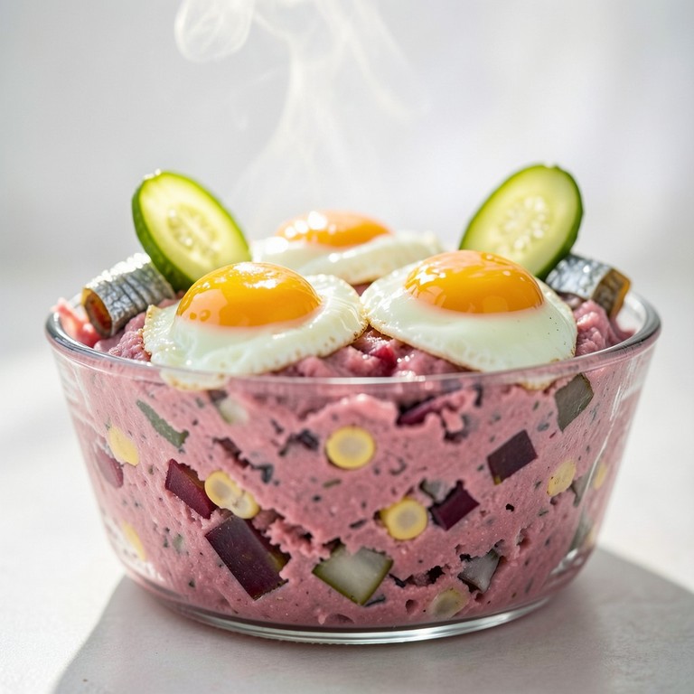 A modern, efficient take on the North German classic, featuring layers of savory corned beef, earthy beets, and potatoes, finished with traditional fried eggs and herring.