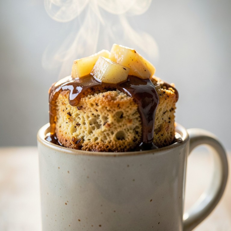 A moist, spiced sponge pudding packed with tender apple pieces and finished with a rich, gooey treacle glaze, made quickly in a microwave mug.