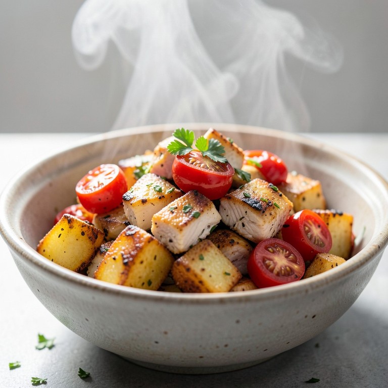A super quick and healthy meal featuring tender chicken, crispy potatoes, and savory tomatoes, all cooked in the air fryer in just 15 minutes.