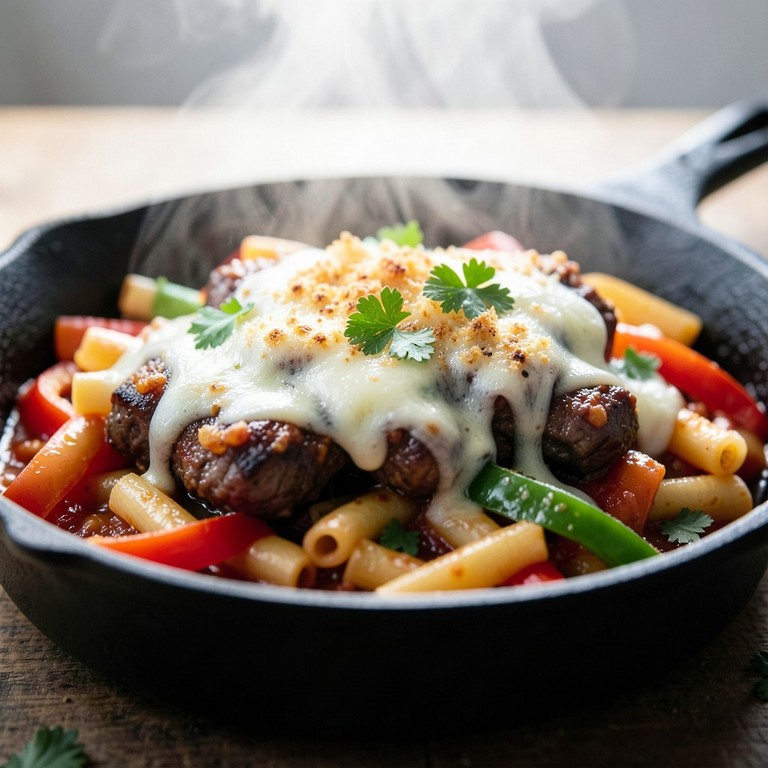 A hearty and comforting one-pan meal featuring tender beef, crisp-tender bell peppers, and al dente pasta tossed in a robust tomato sauce, finished with a blanket of melted cheese.