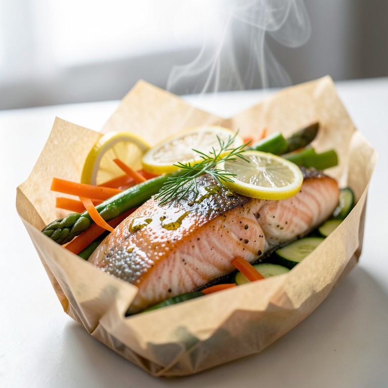 Una técnica de cocción al vapor dentro de papel pergamino que mantiene el pescado increíblemente jugoso, conservando todos sus nutrientes y sabores naturales junto a vegetales crujientes.