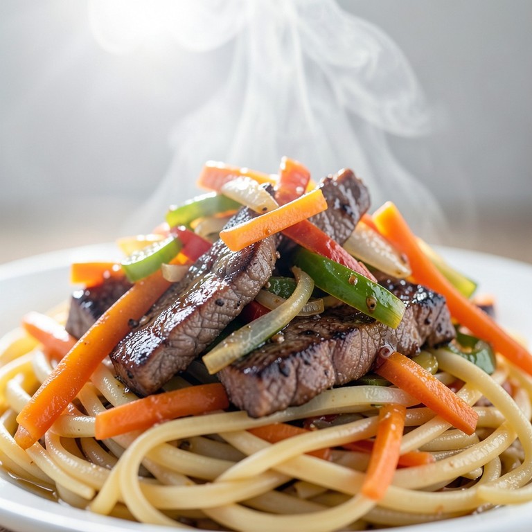 A savory stir-fry featuring tender strips of seared beef and crisp-tender vegetables, tossed with al dente pasta for a delicious fusion twist.