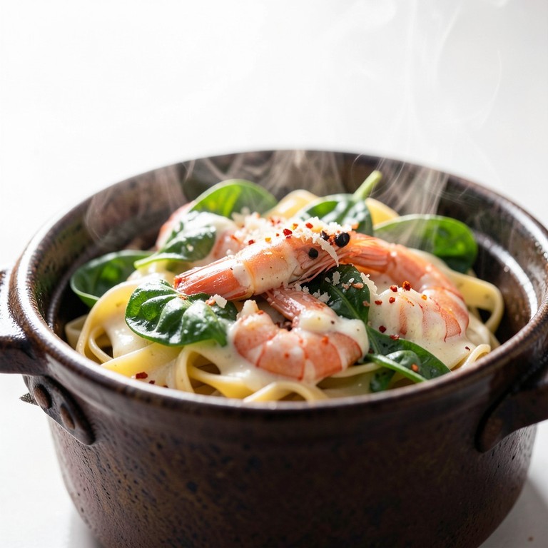 A quick and comforting meal featuring succulent shrimp and fresh spinach wilted in a garlic parmesan sauce, all prepared in a single pot for easy cleanup.