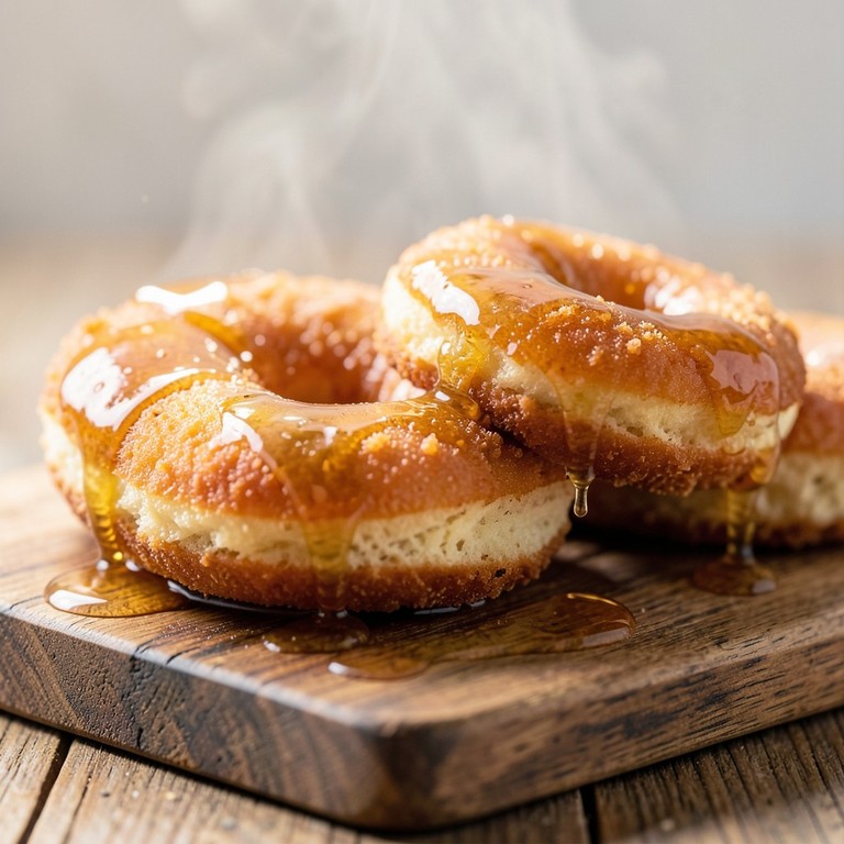 Donas fritas clásicas, esponjosas y doradas, cubiertas con un almíbar brillante y dulce de miel pura que aporta un sabor natural y reconfortante.