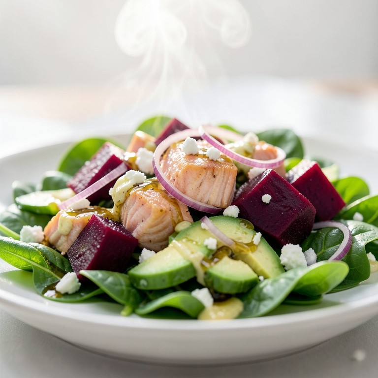 Una ensalada vibrante y nutritiva que combina la frescura de las espinacas con la cremosidad del aguacate, el toque terroso de la remolacha y la intensidad del queso feta, todo coronado con salmón rico en proteínas.