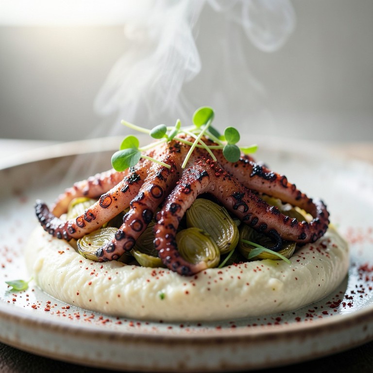 Una exquisita ensalada tibia que combina la textura crujiente del pulpo braseado con la suavidad de un puré de hinojo asado y la frescura de las alcachofas salteadas.
