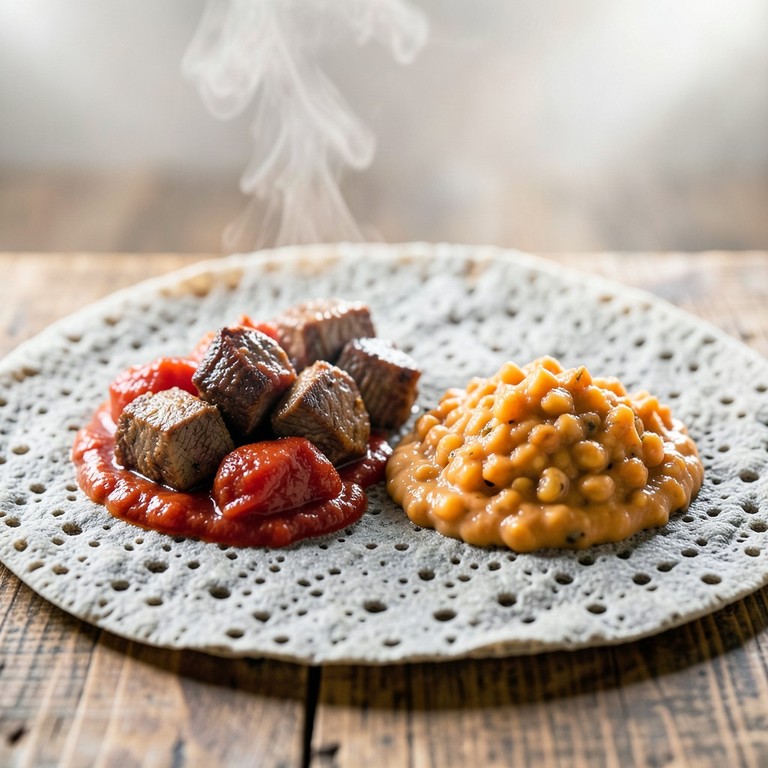 A traditional Somali-inspired spread featuring tender, spice-rubbed lamb suqaar and hearty, aromatic red lentils served over a tangy, sourdough-style buckwheat flatbread.