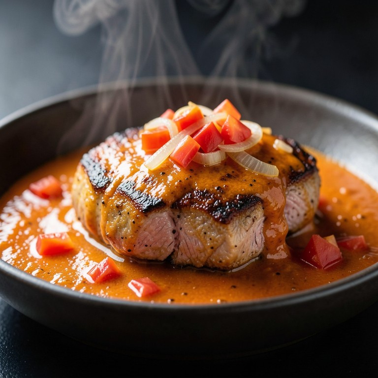 Tender, pan-seared pork shoulder steaks smothered in a unique, tangy, and velvety sauce crafted from a savory blend of ketchup, mayonnaise, and rich beef gravy.