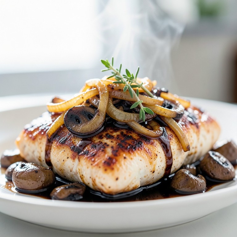 Une recette gourmande mettant en avant la douceur des oignons fondants, mariée à la saveur boisée des champignons et à la tendreté du poulet poêlé.