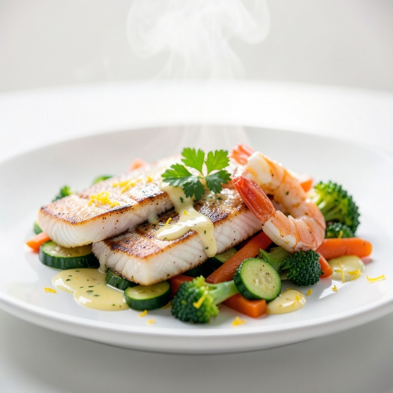 Uma combinação refinada e leve de filé de panga macio e camarões suculentos, grelhados à perfeição e finalizados com uma manteiga cítrica de ervas, servidos sobre uma cama de legumes frescos.
