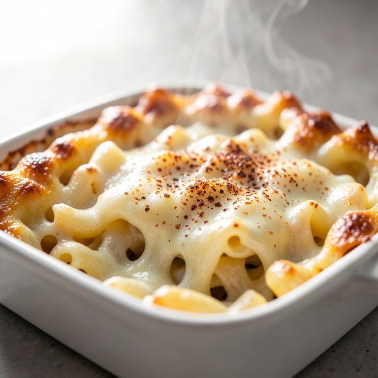 A rich and creamy custard-style baked macaroni and cheese featuring a sharp cheddar and Gruyère blend with a perfectly golden, crispy crust.