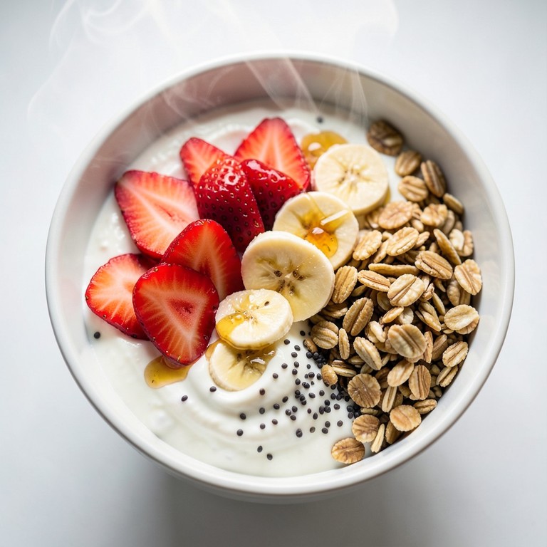 Um café da manhã equilibrado e nutritivo, combinando a cremosidade do iogurte grego com a crocância da granola e o frescor das frutas, rico em fibras e antioxidantes.