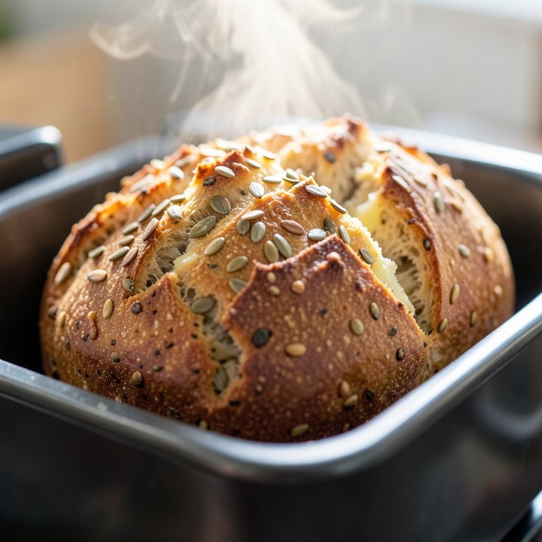 A dense and flavorful wholemeal loaf enriched with sharp Gruyère and a crunchy seed blend, perfectly sized for a 500g breadmaker cycle.