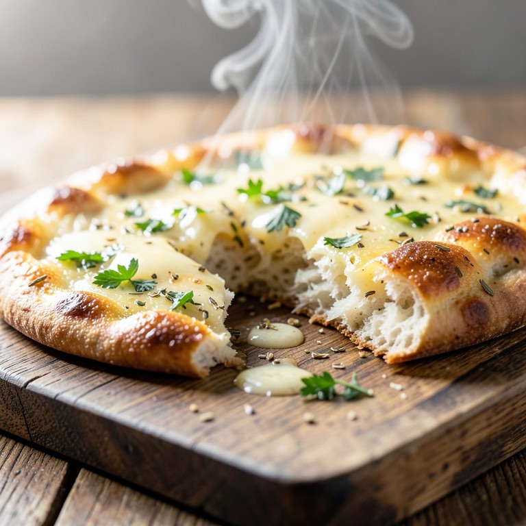 A savory, aromatic flatbread featuring a soft, chewy interior and a crispy, golden-brown crust, infused with a fragrant garlic and herb butter.