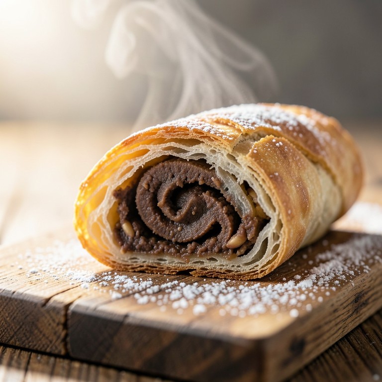Um rocambole húngaro tradicional com massa amanteigada que derrete na boca, recheado com uma pasta densa e aromática de amendoim, perfeito para acompanhar um café ou chá.