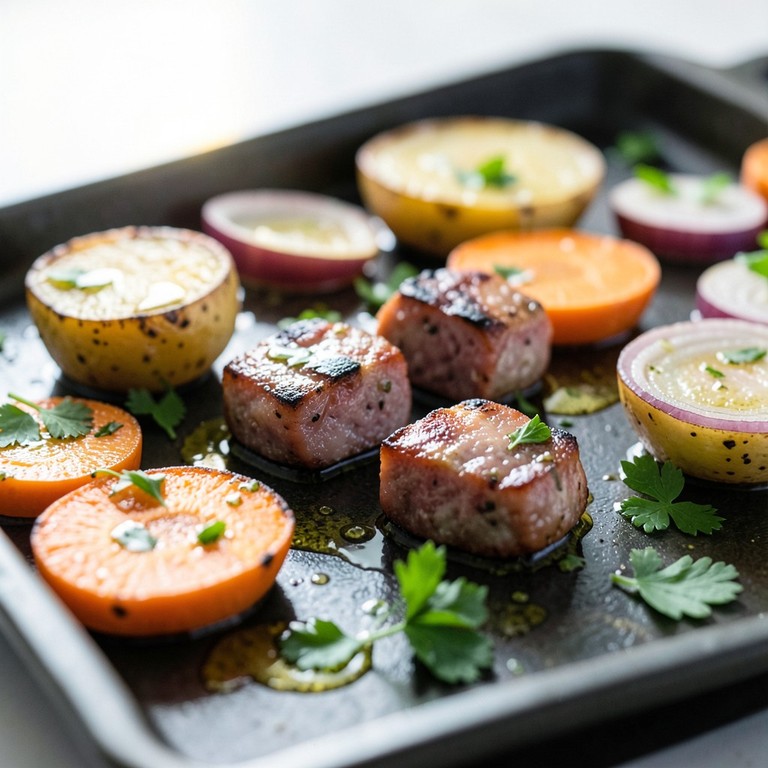 An effortless one-pan dinner featuring savory Italian sausages roasted alongside tender root vegetables and sweet bell peppers, seasoned with aromatic herbs for a simple, budget-friendly meal.
