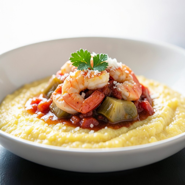 Uma polenta extremamente cremosa e reconfortante, servida com um ragú sofisticado de camarões suculentos e corações de alcachofra, finalizado com um molho leve de tomate e vinho branco.
