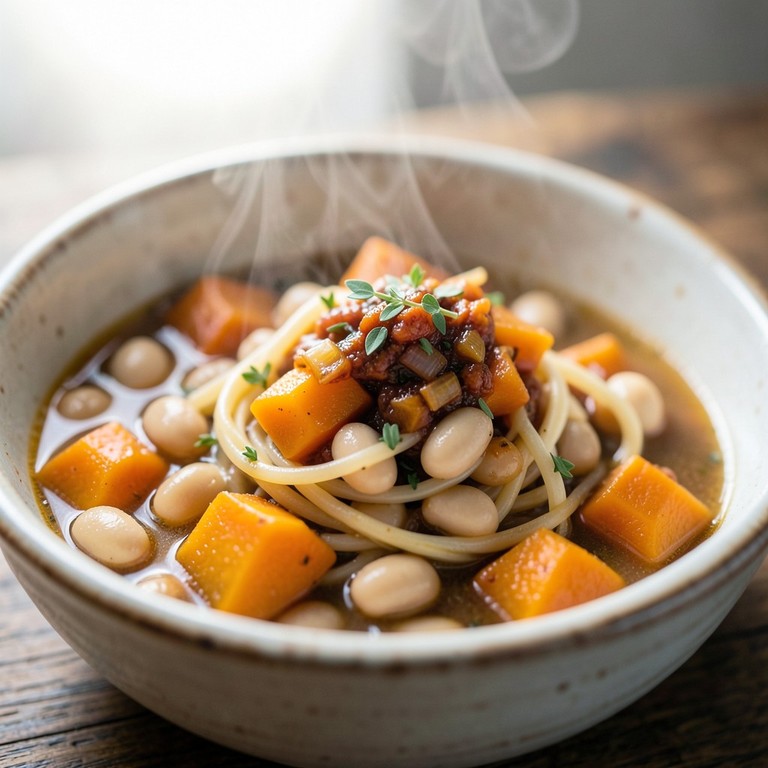 Un plato reconfortante y clásico de la cocina chilena, compuesto por porotos granados, zapallo tierno y tallarines, todo realzado por un sofrito aromático de cebolla y ají de color.