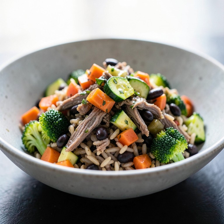 Uma refeição completa, prática e nutritiva, que combina a proteína da carne desfiada com a fibra do arroz integral e do feijão, finalizada com legumes frescos salteados.