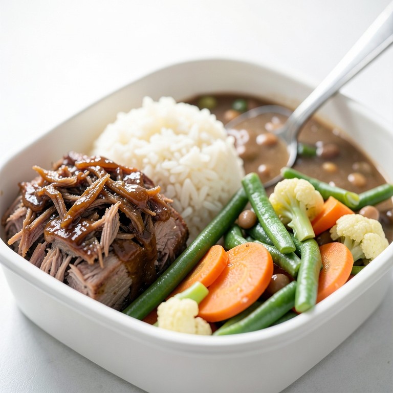 Uma refeição completa, equilibrada e nutritiva, perfeita para marmitas, combinando a suculência da carne desfiada com o conforto do arroz e feijão e a leveza dos legumes frescos.