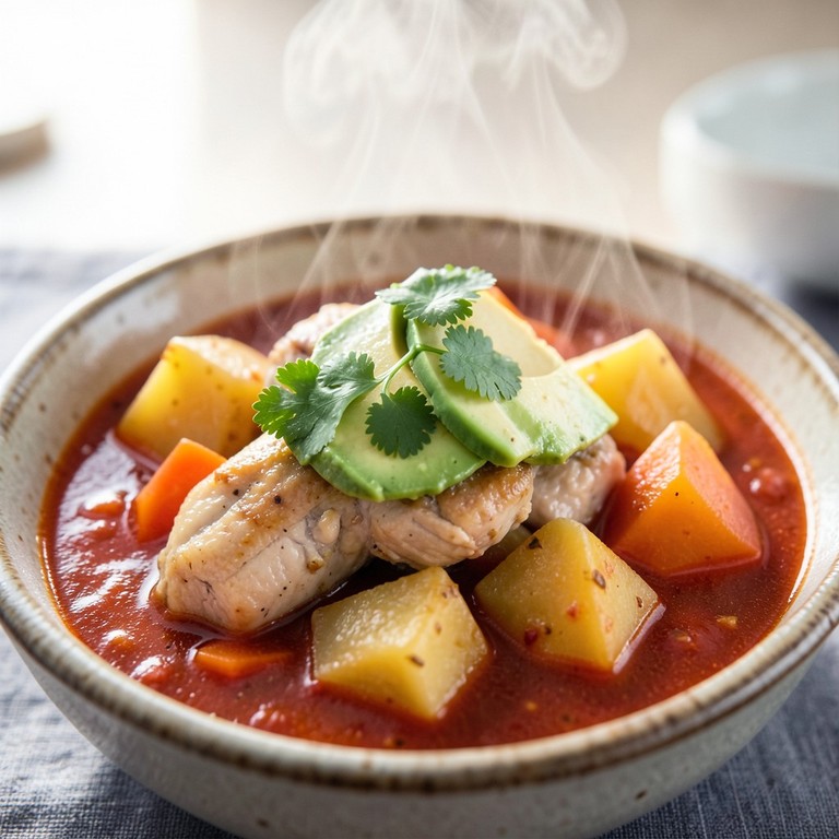 Un reconfortante guiso casero de pollo tierno, papas y zanahorias cocinado en una salsa de jitomate aromática, terminado con la cremosidad del aguacate fresco.