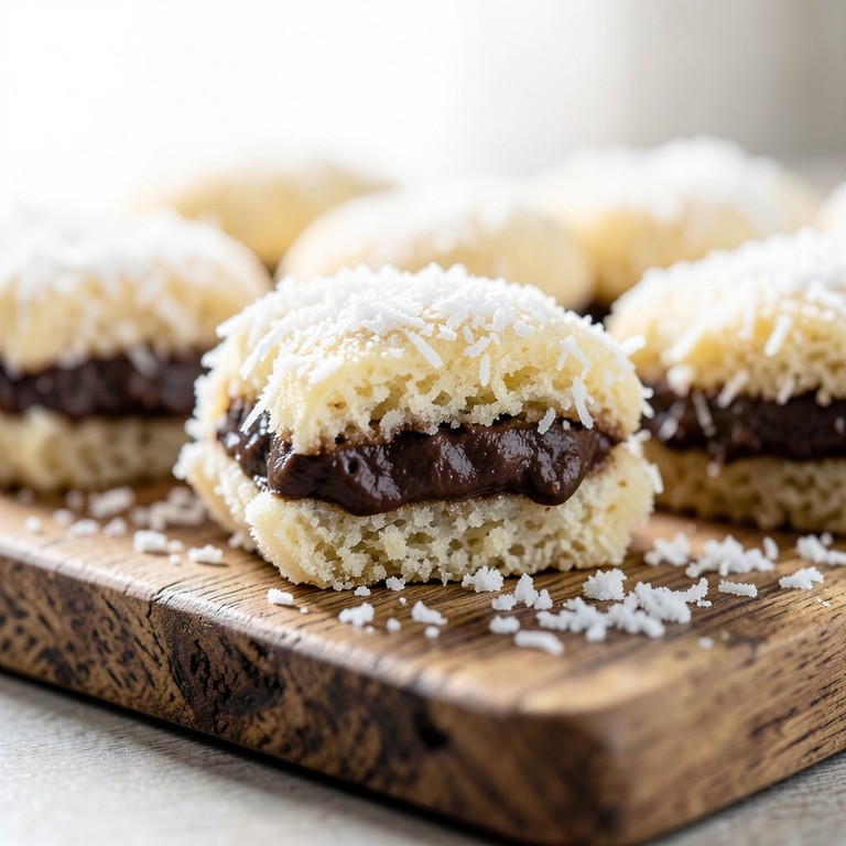 Clásicos alfajores argentinos de textura suave y quebradiza, rellenos con una generosa capa de dulce de leche y decorados con coco rallado, ideales para acompañar un café o té.