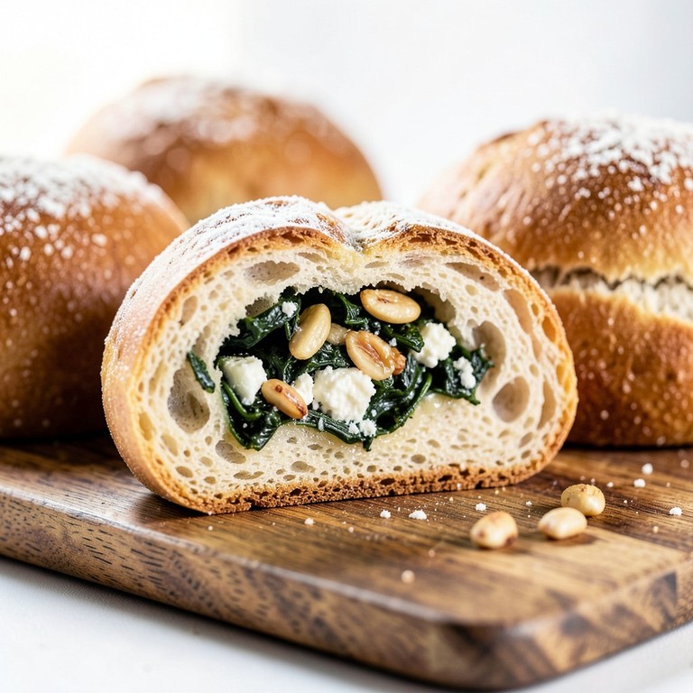 Soft and wholesome spelt bread rolls filled with a savory, aromatic mixture of sautéed spinach, tangy feta cheese, and crunchy toasted pine nuts.