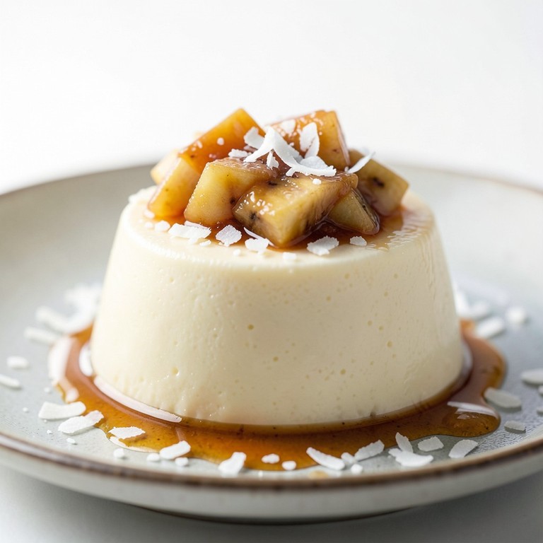 Uma sobremesa tropical irresistível, combinando a textura aveludada do pudim de leite de coco com o sabor doce e reconfortante da compota caseira de banana e maçã.