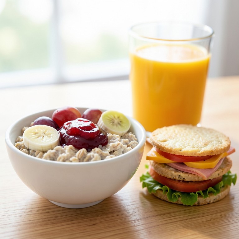Un desayuno completo y equilibrado que combina la calidez de la avena dulce con frutas frescas y un acompañamiento salado de galletas de arroz, jamón y queso para empezar el día con energía.