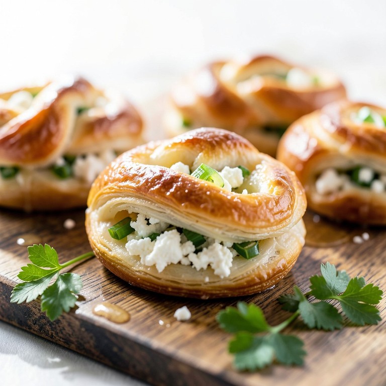 A buttery, enriched yeast pastry braided to perfection, featuring a savory and tangy filling of crumbled feta cheese, fresh scallions, and herbs.