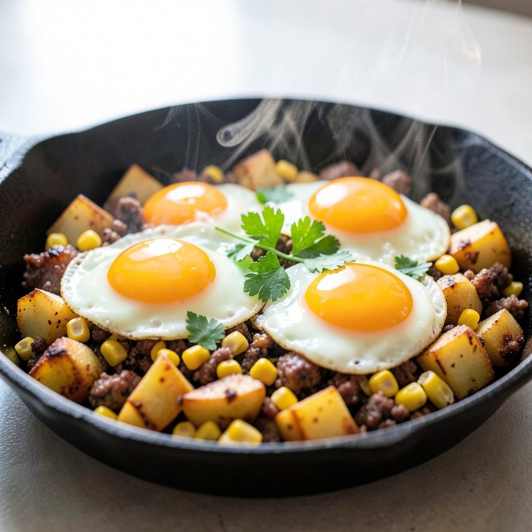 A hearty and satisfying one-pan breakfast featuring crispy diced potatoes, savory crumbled sausage, and sweet corn, topped with perfectly fried eggs for a protein-packed start to the day.