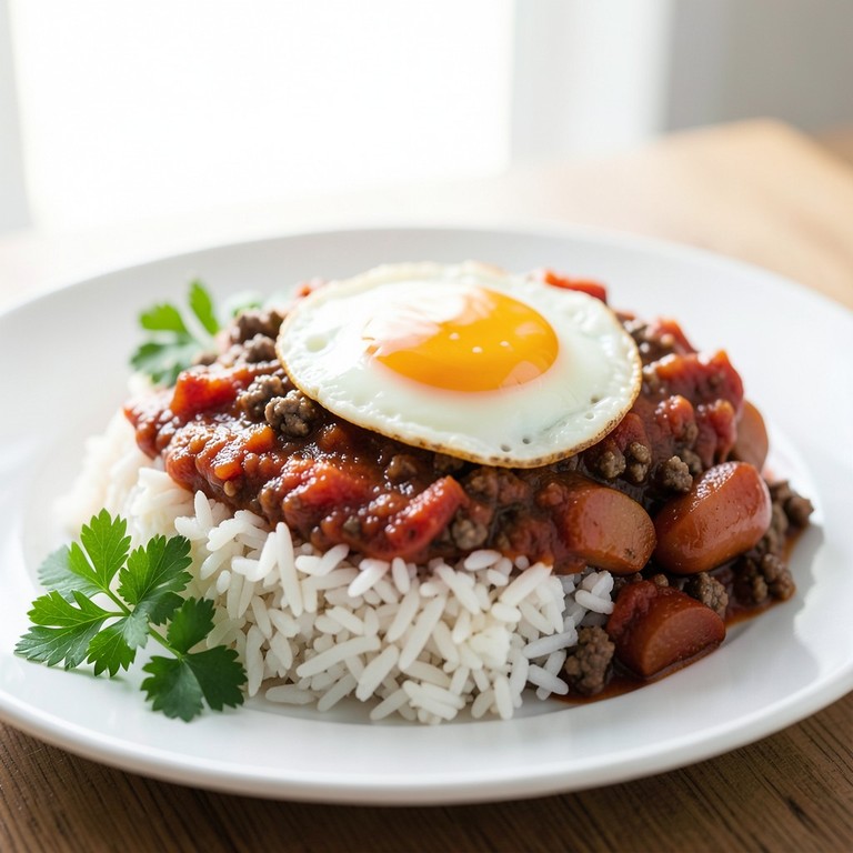 Un plato clásico y reconfortante que combina arroz blanco esponjoso con una sabrosa salsa de tomate cargada de carne picada y rodajas de salchicha, ideal para una comida familiar completa.