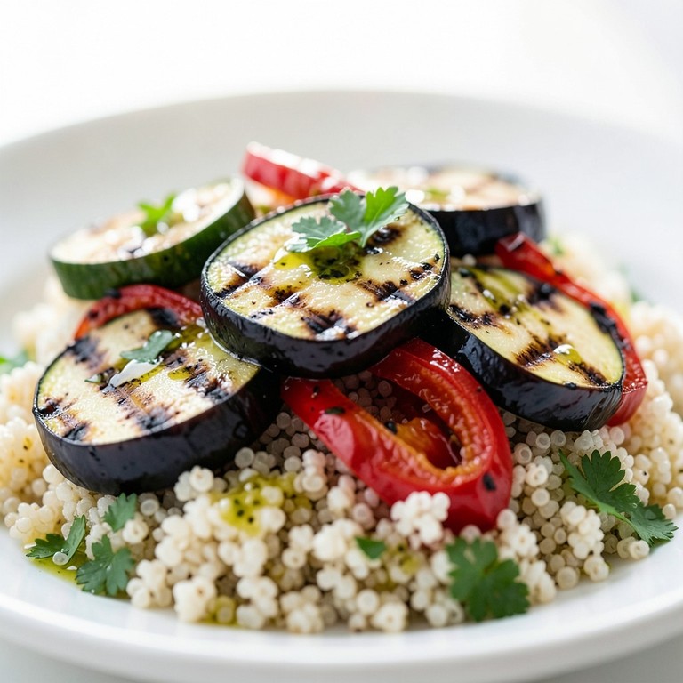 Una ensalada nutritiva y reconfortante que combina la textura suave de la quinoa con el sabor ahumado de las verduras mediterráneas asadas, realzada por un aliño cítrico y fresco.