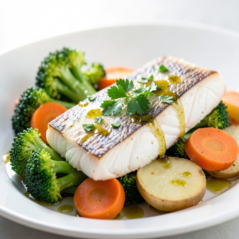 Uma refeição clássica, leve e saudável, onde a pescada do cabo é cozida suavemente no vapor junto com batatas e legumes frescos, preservando todos os nutrientes e sabores naturais.