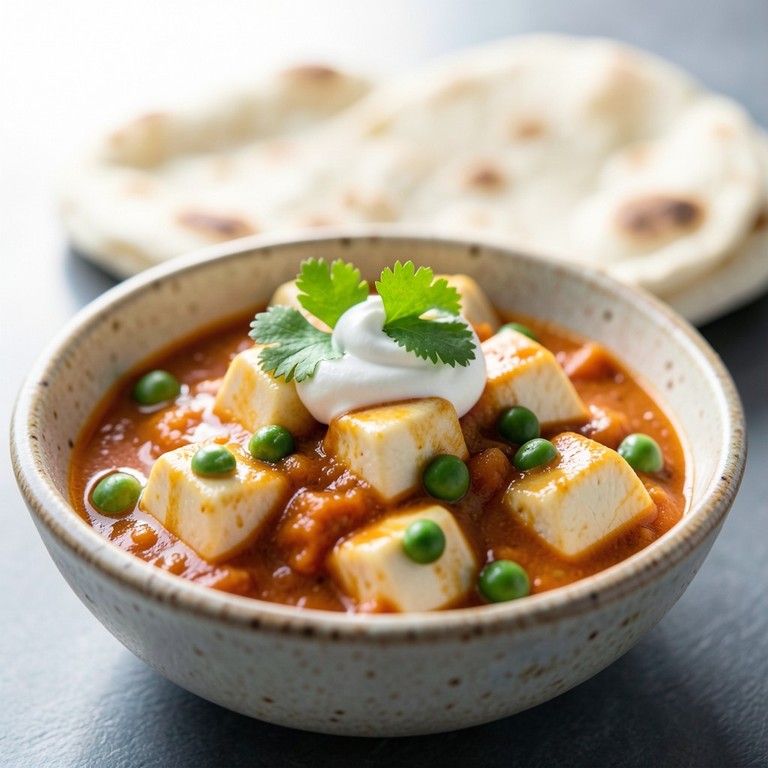 A traditional North Indian comfort dish featuring tender green peas and paneer in a spiced tomato sauce.