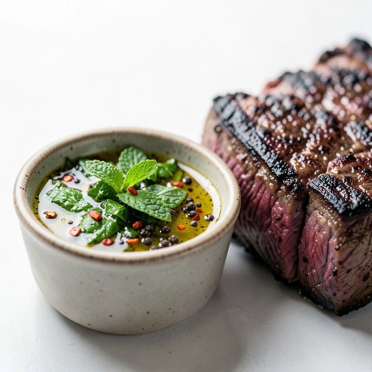 Uma variação refrescante e aromática do clássico molho argentino, combinando o frescor vibrante da hortelã com o calor da pimenta-do-reino, ideal para equilibrar a suculência de cortes de carne gordurosos.