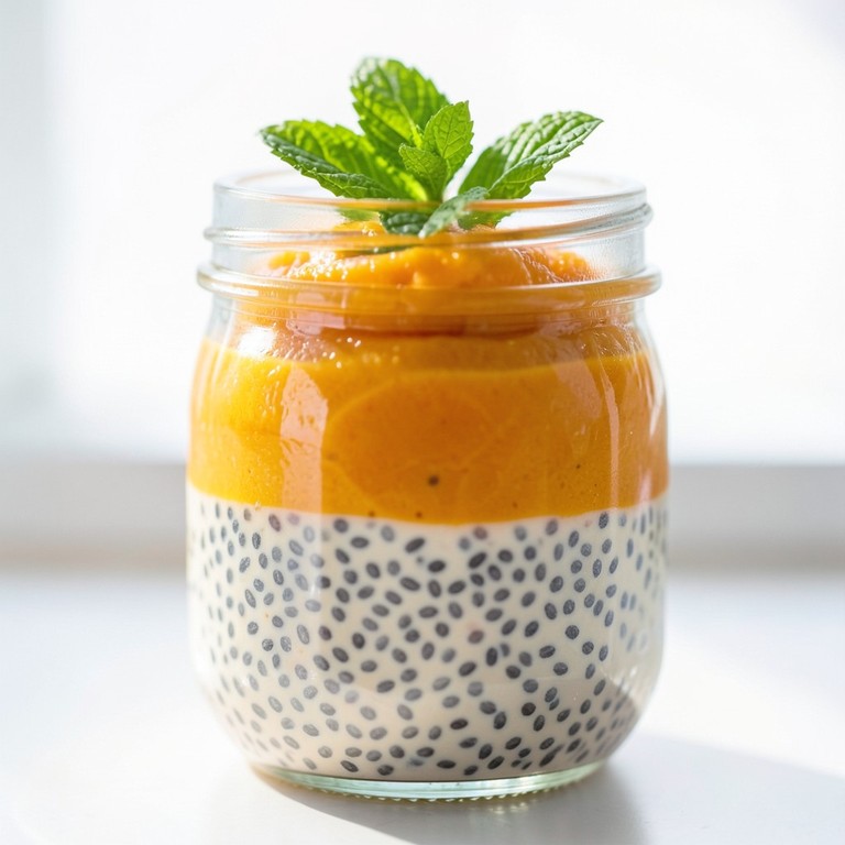 Uma sobremesa refrescante e nutritiva, composta por sementes de chia hidratadas em leite vegetal e finalizada com um purê aveludado de manga fresca.