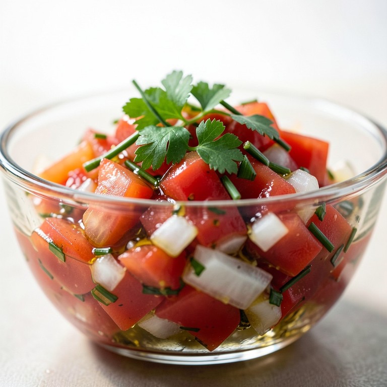 Uma mistura equilibrada e refrescante de tomate, cebola e cheiro-verde, realçada pelo toque ácido do vinagre e a suavidade do azeite, ideal para acompanhar churrascos e pratos do dia a dia.