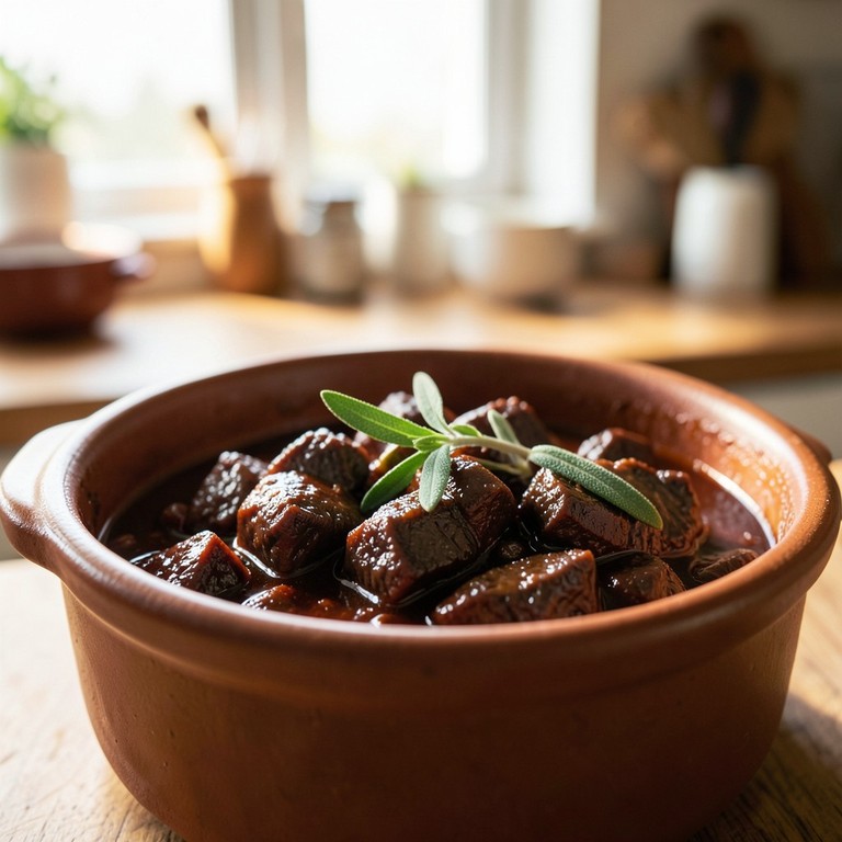 A slow-cooked, rich stew featuring tender beef, caramelized onions, smoked paprika, and fresh sage, prepared in a traditional clay pot for maximum depth of flavor.
