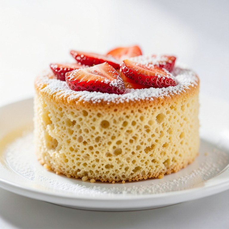 A light and airy sponge cake made with whipped eggs for natural lift, infused with delicate strawberry flavoring and topped with fresh berries.